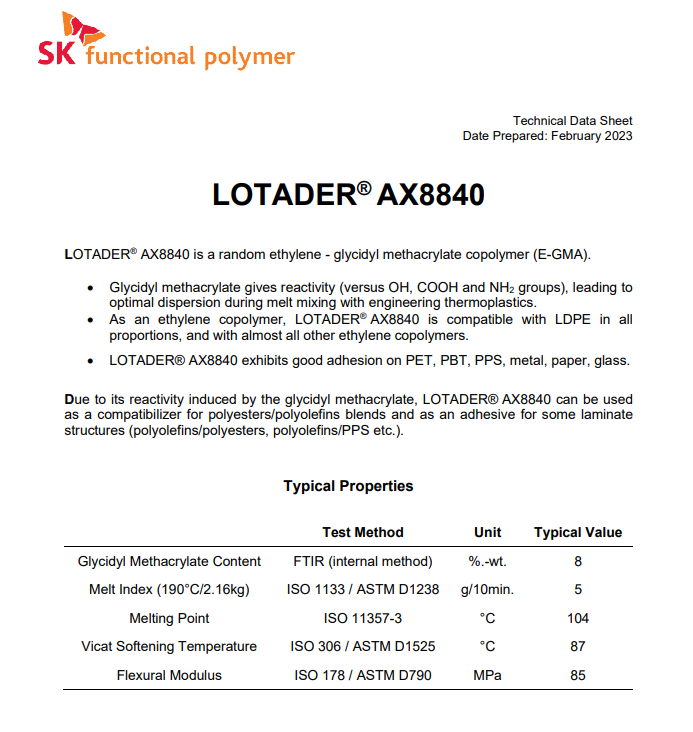 - EMA 法國阿科瑪Lotader AX 8840 粘接性好 無規(guī)共聚物 可分散 塑料改性 粘合劑 物性表, EMA 法國阿科瑪Lotader AX 8840 粘接性好 無規(guī)共聚物 可分散 塑料改性 粘合劑 產(chǎn)品參數(shù),EMA 法國阿科瑪Lotader AX 8840 粘接性好 無規(guī)共聚物 可分散 塑料改性 粘合劑 性能表,EMA 法國阿科瑪Lotader AX 8840 粘接性好 無規(guī)共聚物 可分散 塑料改性 粘合劑 出廠報告, MSDS,, 物質(zhì)安全資料表, UL黃卡,{ SGS報告, RoHS, 食品級認證, NSF飲用水標準, 產(chǎn)品資料, 產(chǎn)品性能, 出廠報告, 原廠原包, 代理商, 熱變形溫度, 熔指數(shù), 流動系數(shù), 抗沖擊性能、沖擊強度, 低溫韌性、低溫抗沖擊性能, 熔體流動系數(shù)、熔體流動速率, 加工工藝、加工參數(shù)、加工溫度, 歐盟RoHS 德國FDA 美國FDA 日本FDA