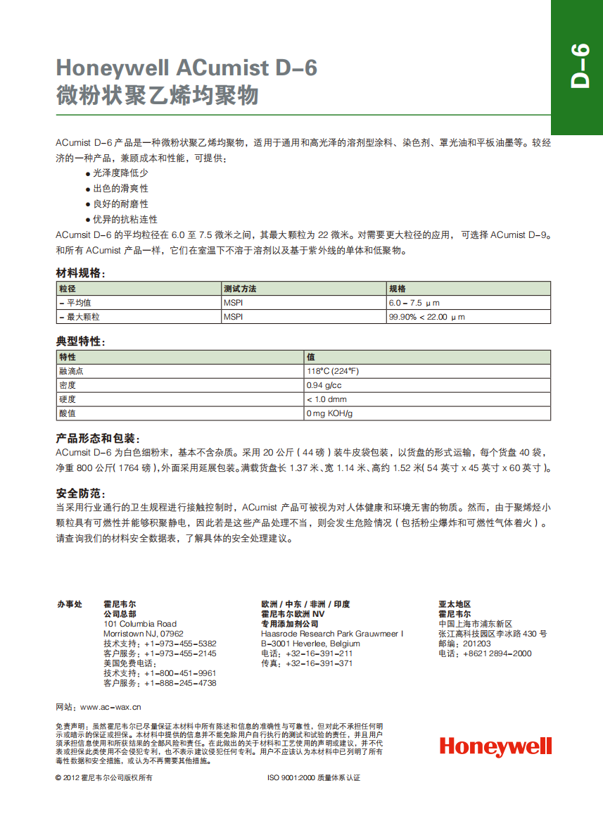 • 霍尼韋爾微粉蠟D6聚乙烯均聚物Honeywell ACumist D-6 物性表, 霍尼韋爾微粉蠟D6聚乙烯均聚物Honeywell ACumist D-6 產(chǎn)品參數(shù),霍尼韋爾微粉蠟D6聚乙烯均聚物Honeywell ACumist D-6 性能表,霍尼韋爾微粉蠟D6聚乙烯均聚物Honeywell ACumist D-6 出廠報(bào)告, MSDS,, 物質(zhì)安全資料表, UL黃卡,{ SGS報(bào)告, RoHS, 食品級(jí)認(rèn)證, NSF飲用水標(biāo)準(zhǔn), 產(chǎn)品資料, 產(chǎn)品性能, 出廠報(bào)告, 原廠原包, 代理商, 熱變形溫度, 熔指數(shù), 流動(dòng)系數(shù), 抗沖擊性能、沖擊強(qiáng)度, 低溫韌性、低溫抗沖擊性能, 熔體流動(dòng)系數(shù)、熔體流動(dòng)速率, 加工工藝、加工參數(shù)、加工溫度, 歐盟RoHS 德國(guó)FDA 美國(guó)FDA 日本FDA